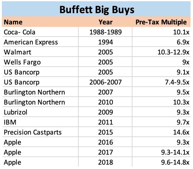 The topic of Buffett applying this multiple to equity purchases saw a rise in popularity in 2014, when Brooklyn Investor wrote a popular blog post about Berkshire’s investments in Coca-Cola, American Express and other companies. A commenter in the post mentioned Buffett purchasing McDonald’s at 10 turns in 1990. In 2022, Todd Combs outlined how he and Buffett found Apple in 2016 by screening with the following questions: “How many names in the S&P are going to be 15 times earnings [10 times pretax profits] in the next 12 months? How many are going to earn more in five years (using a 90% confidence interval), and how many will compound at 7% [10% pretax income growth] (using a 50% confidence interval)?”
